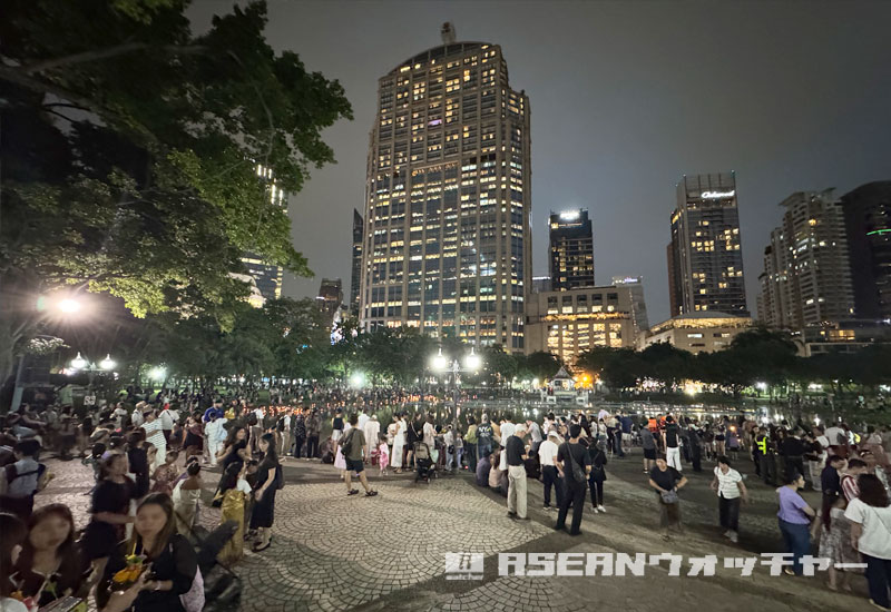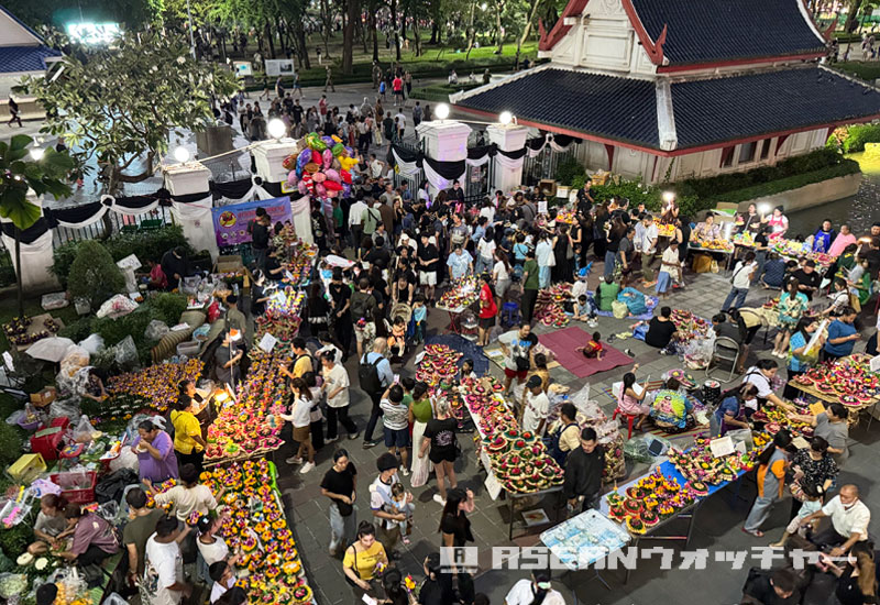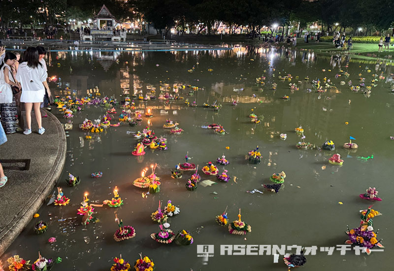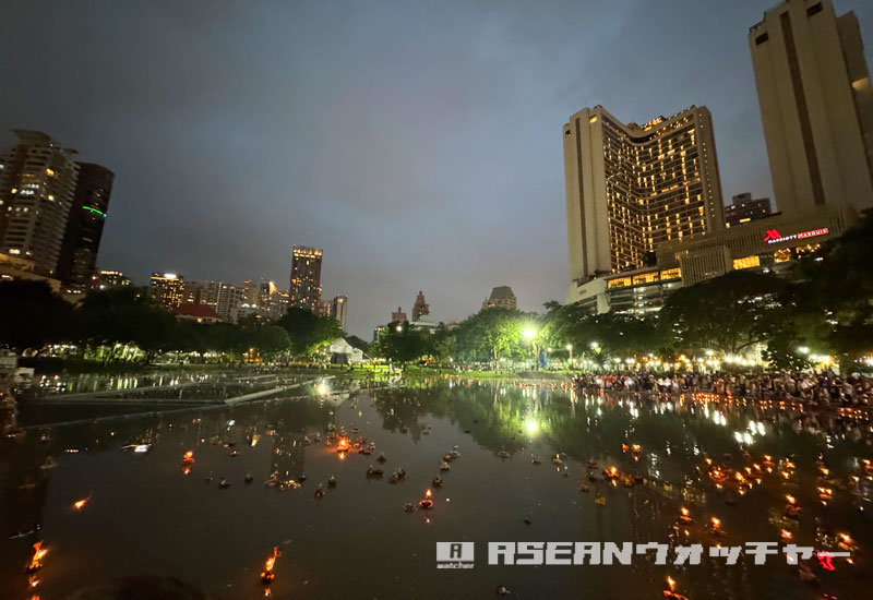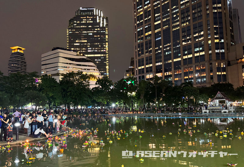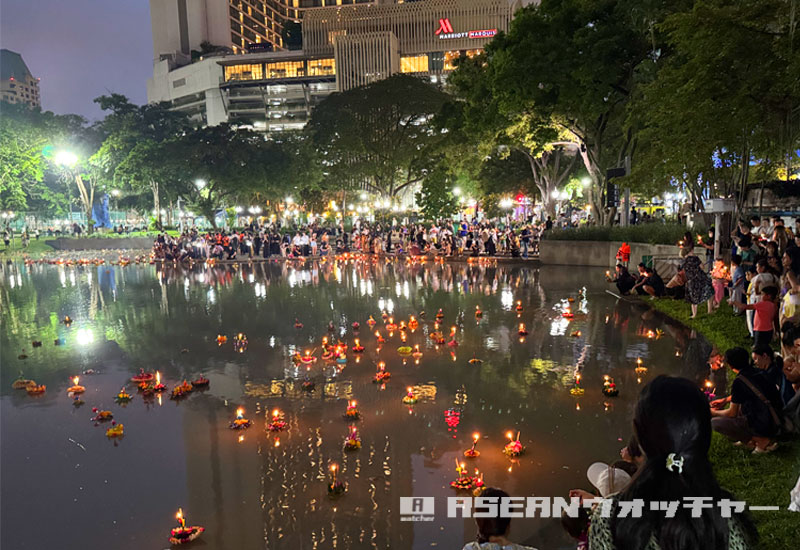 タイの秋の風物詩である灯籠流し「ロイクラトン」が、11月5日にタイの各地で行われました。タイでは毎年、河川や海、公園などがお祭りの会場となります。今年は10月24日にタイのシリキット王太后陛下が崩御され、喪中の開催となりました。日本人が最も集まる会場であるプロンポンのベンジャシリ公園をはじめ、ルンピニ公園、チャオプラヤー川のウォーターフロントなど、各会場の様子をご紹介いたします。