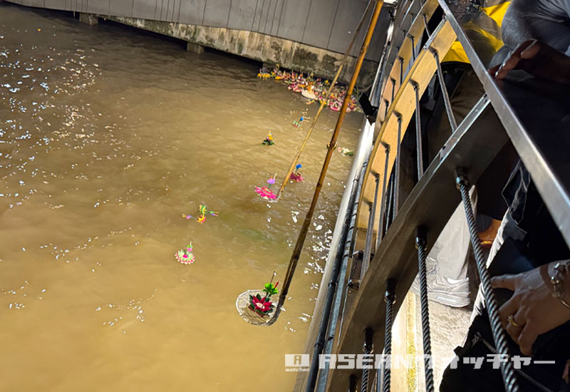 チャオプラヤー川横にウォータースライダーが設置されていますが、順番待ちで長蛇の列ができていました。列に並ばず灯籠流しができるのが、こちらの竿を使って水に灯籠を浮かべるエリアです。