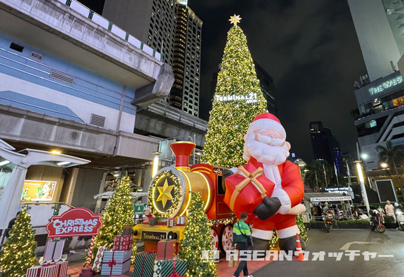 雪は降りませんが、たっぷりとクリスマス気分をあじわえるのが、ショッピングモールのクリスマスイルミネーションです。これらのクリスマスツリーは年明けも飾られているので、新年にタイに旅行に来られた方にはなんとも不思議な景色として印象に残ることでしょう。