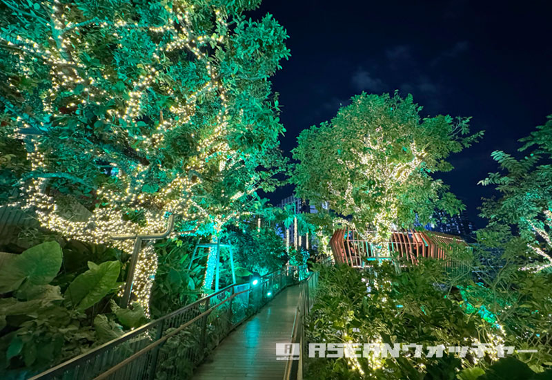 ルーフトップ公園のデュシット・アルンから、ルンピニ公園のクリスマスイルミネーションとビル群の夜景を眺めることができます。